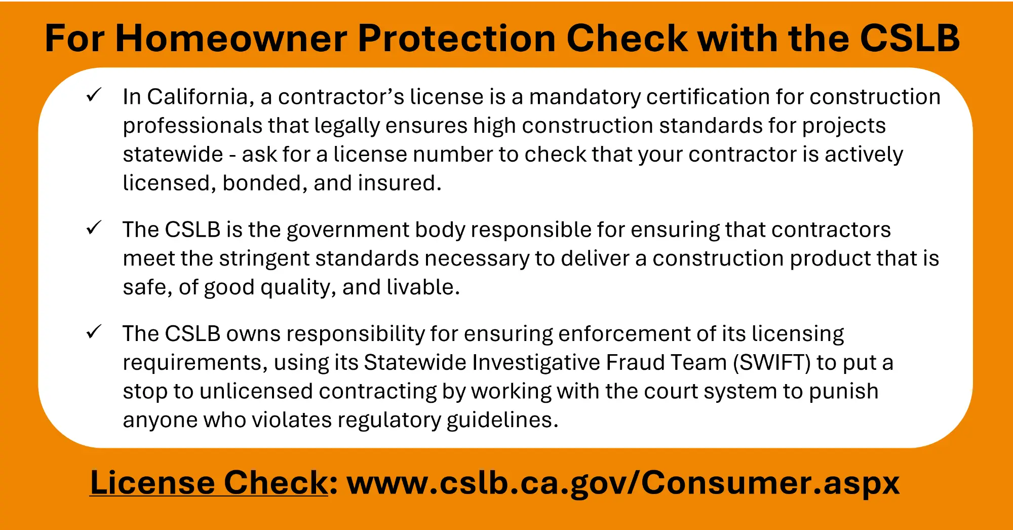 If you want protection from financial responsibility for accidents or property damage during your remodel project, know that an actively licensed contractor is required to carry liability and workers compensation insurance. When embarking on a remodel, be safe, rather than sorry – hire only an actively licensed contractor! Find your contractor and their licensing details by visiting the Department of Consumer Affairs Contractors State Licensing Board (CSLB) or by clicking here.